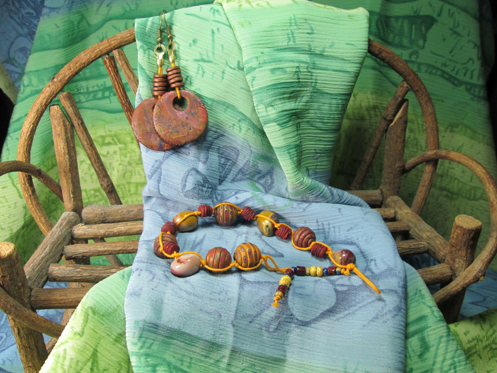 I had a small collection of rustic Ridged Rounds from Rebekah of Tree Wings Studio which I interspersed with some Mookaite Jasper nuggets for the bracelet. There are also some cool burgundy spacers in organic polymer clay shapes, also by Rebekah, for variety. The simple tassels are Picasso Czech glass beads. Finally, the earrings are an easy design featuring Rebekah's PC rounds in a gorgeous pearly finish, topped with 8mm Mykonos Greek ceramic washers stacked over cord ends.