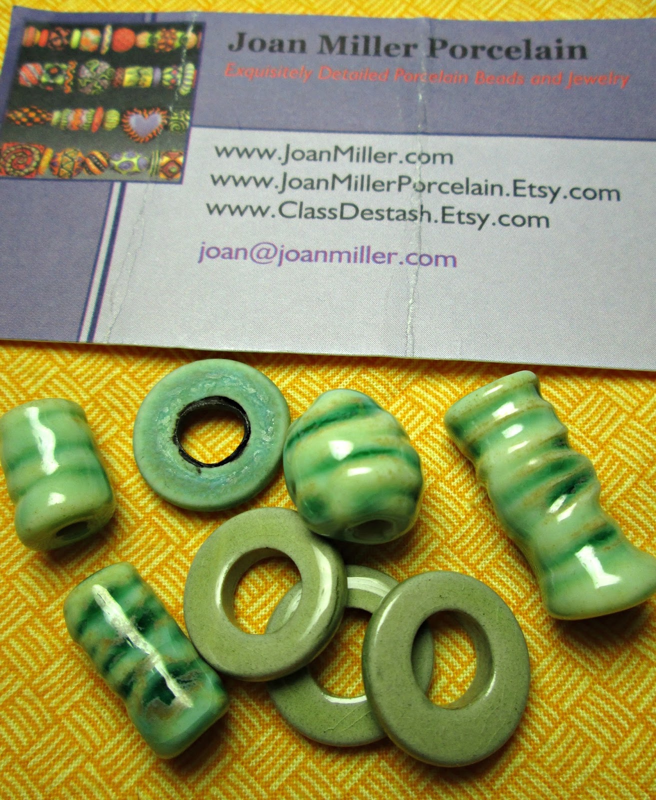 Welcome to my reveal for the 2013 Summer Color Surprise, hosted by Lisa Lodge of A Grateful Artist - Pine Ridge Treasures. Waaaaay back in March, Lisa offered to send us some "surprise beads". No one knew what to expect! I requested some artisan beads and was pleased to receive a selection of porcelain by Joan Miller in a lovely green shade and mostly organic shapes.