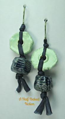 Week 36: Ceramic discs in light green, on silk cord, both from Marsha Neal Studio. The organic blue beads are by Potterygirl1. My own handmade earwires in green niobium.
