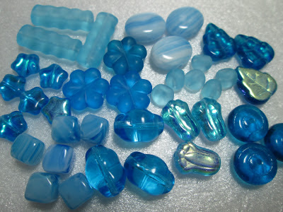 A couple weeks ago, while drooling over the gemstones at Magpie, I stumbled across some great bargains in Czechs: 100 g (that's nearly a 1/4 pound!) bags of beads, sorted by colour... only $4.99 per bag. I had to have some... O.K. a LOT! I've just sorted the blue so far; each bag has "between 100 and 200" beads in 10 different designs. I love them all!