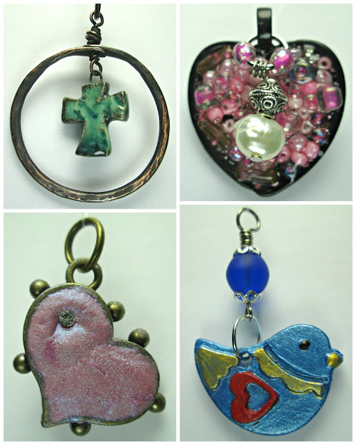 Gorgeous handmade ceramic cross in a hammered copper ring by Terri DelSignore, resin-filled seed bead heart by Shelley Graham Turner (oops, her donation sold right away also, link is to Shelley's blog), sweet little bird charm of stoneware, hand-painted by Vanessa Gilkes, beautiful polymer clay heart treated with color-changing Pearl-Ex powder by Shaiha Williams.